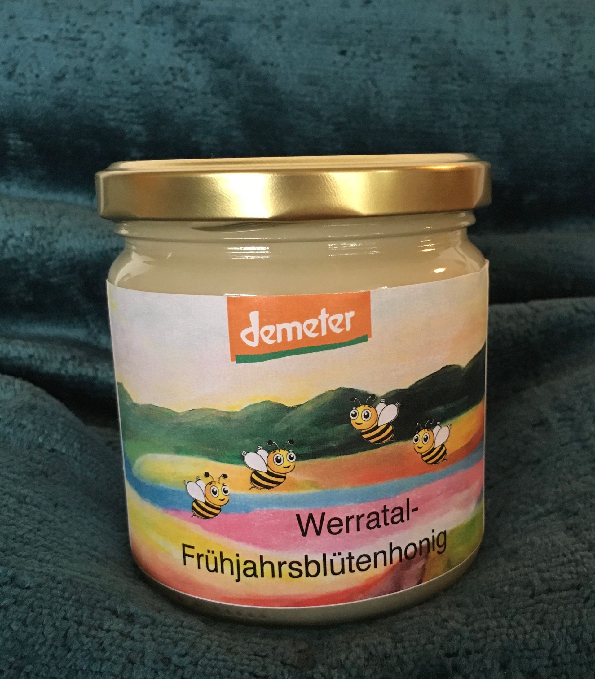 Ein fein-cremiger, milder Honig, aus dem Nektar aller Frühblüher wie z.B. Weide, Obst und Löwenzahn. In Witzenhausen ist besonders die Kirschblüte weit verbreitet. Hinzu kommt, je nach Blütenverlauf, ein großer Rapsanteil.